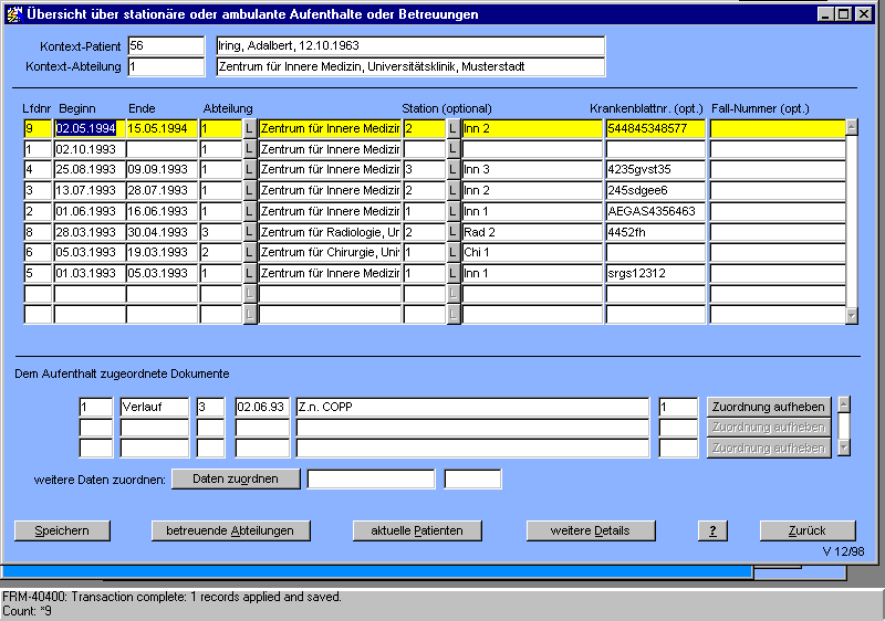 Da einem Aufenthalt mehrere Dokumente zugeordnet werden können, werden im unteren Bildschirmabschnitt die weiteren zugeordneten Daten angezeigt. Hier können über den Knopf "Daten zuordnen" auch weitere Dokumente zugeordnet, bzw. durch "Zuordnung aufheben" die Zuordnung von Dokumenten aufgelöst werden.