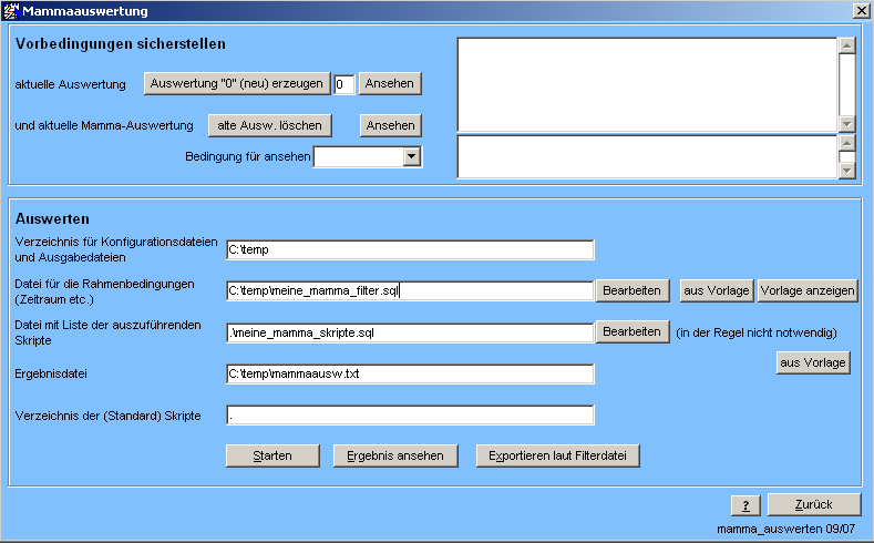 Vor dem Start der Auswertung müß die Datei "meine_mamma_filter.sql" angepaßt werden, um festzuelegen