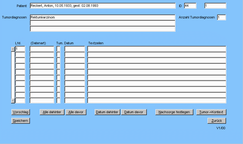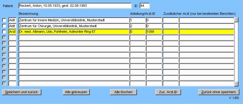 Im Zusammenhang mit dieser Maske stehen auch die Adressaten, in der bei Briefen, die an mehrere Adressaten geschrieben werden sollen, die Adressaten ausgewählt werden können, und die "Geschichte für den Bogen" mit der Textbausteine für eine bestimmte Art von Dokumentationsbögen erstellt werden können.