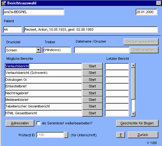 In dieser Maske werden Druckfunktionen aufgerufen. Angezeigt werden alle im Kontext sinnvollen Berichte, d.h., falls ein Dokument im Kontext ist, auch dokumentbezogene Berichte, ansonsten patientenbezogene Berichte oder register-/abteilungsbezogene Berichte (in Aufbau).
