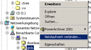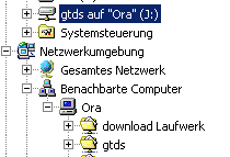 In der Netzwerkumgebung muß der Computer, auf dem die GTDS-Dateien liegen gesucht werden. Bei der Anzeige der freigegebenen Ressourcen kann dann über Kontex-Menü oder Menüleiste dem GTDS-Verzeichnis ein Laufwerk zugeordnet werden (in diesem Fall heißt der Server ORA, die Freigabe GTDS und das zugeordnet Laufwerk J:).