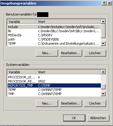 Da insbesondere bei minimalen Installationen das GTDS-Verzeichnis gegen Schreibzugriffe geschützt ist, muß dem Berichtsprogramm "ReportWriter" mitgeteilt werden, wo es seine temporären Dateien, die sie standardmäßig im aktuellen Verzeichnis erzeugen möchte, ablegen soll. Dies geschieht über die Umgebungsvariable REPORTS25_TMP. Unter Windows 95/98/ME kann diese Variable in der AUTOEXEC.BAT bestimmt werden (z.B. durch die Zeile SET REPORTS25_TMP=C:\TEMP), unter Windows NT/2000 über Systemsteuerung=>System=>Umgebung, am besten gleich für alle Benutzer: