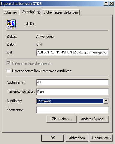 Dabei ist J: der Pfad zu Ihrer Netzwerkverbindung. "meier" steht als Vorgabe für den Benutzernamen, "@gtds" für das Datenbankalias im SQL*Net. Von der prinzipiellen möglichen Angabe eines Benutzerpasswortes raten wir aus Sicherheitsgründen ab.