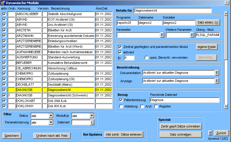 Weiterhin werden zentral gepflegte sowie eigene Module unterschieden. Für zentral gepflegte Module werden die Beschreibungen zentral verteilt und beim Einlesen während des Updates aus den sogenannten RXM-Dateien aktualisiert. Das bedeutet, daß eigene Änderungen an Parametern (z.B. beim tabellarischen Gesamtbericht) überschrieben werden. Um das zu verhindern, sollte für Module, die selbst parametrisiert werden, eine eigene Kopie des Datensatzes angelegt werden, die dann als nicht zentral gepflegt markiert wird. Bei den eigenen Kopien werden dann natürlich neue Parameter nicht automatisch hinzugefügt. In diesen Fällen sollte also bei Updates kontrolliert werden, ob vielleicht neue Parameter verfügbar sind.