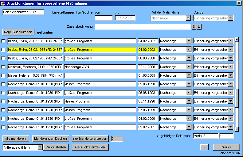 bzw. die darauf basierende Datenbanksicht(View) EINBESTELLBRIEFE. Diese enthält zusätzlich den Namen des Patienten und schließt Verstorbene aus.