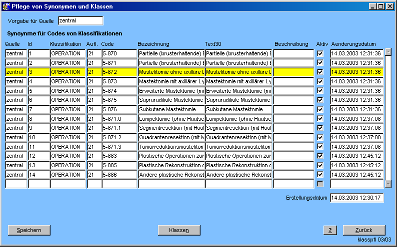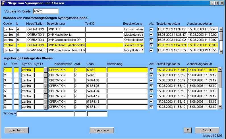 Hier werden Codes zu Klassen zusammengefaßt, z.B. um bei der Auswertung oder der Vorbelegung der DMP-Maske Mammakarzinom alle Operationen mit axillärer Lymphonodektomie über die einfache Angabe der entsprechenden Klasse "DMP Axilläre Lymphonodektomie" (=zentral 7) herauszusuchen.