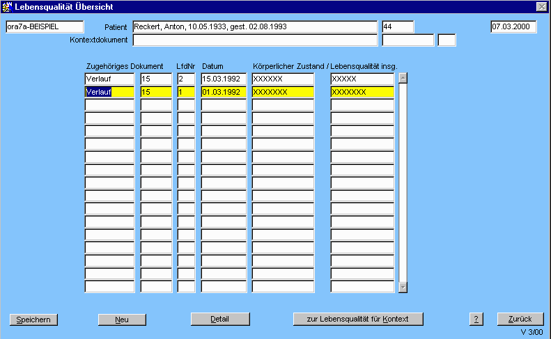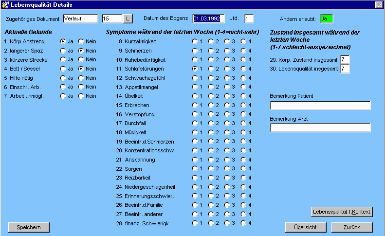 Die Berechtigung zur Bearbeitung richtet sich nach der des zugeordneten Dokuments. Kann dieses durch den aktuellen Benutzer / die aktuelle Abteilung bearbeitet werden, so darf auch der Lebensqualitätsbogen bearbeitet werden.