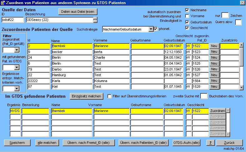 Mit dieser Maske können Patienten aus externen Systemen (d.h. Patienten aus anderen Einrichtungen, Studien, Doktorarbeiten ...), die in die Tabelle MATCH_PATIENT eingelesen wurden (z.B. durch Einlesen aus einer Datei), Patienten des GTDS zugeordnet und gegebenfalls auch in das GTDS aufgenommen werden.