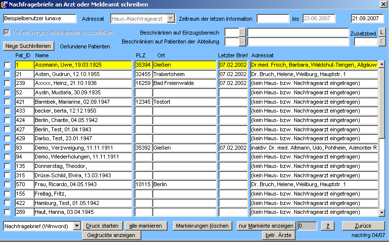 Die Organisation des sogenannten Follow-up ist eine der Hauptfunktionen klinischer Krebsregister. Für Patienten, bei denen das Datum der letzten Information längere Zeit zurückliegt, können in dieser Maske Druckfunktionen angesteuert werden.