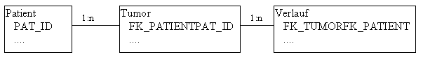 DIAGNOSETEXT in TUMOR gehört zu den Informationen über einen Tumor direkt. FK_PATIENTPAT_ID entspricht in der Tabelle PATIENT der PAT_ID und dient zum Verknüpfen (Join) von TUMOR und PATIENT.