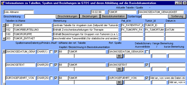 Aus dem gleichen Grund kann es vorkommen, daß mehrere Spalten einer Tabelle die gleiche Spalte in einer anderen Tabelle referenzieren. Zum Beispiel beziehen sich in HISTOLOGIE sowohl FK_TUMORFK_PATIENT als auch FK_VERLAUFFK_TUMO0 auf PAT_ID in PATIENT. Das Design-Tool ist in diesem Fall davon ausgegangen, daß der zugehörige Tumor zu einem anderen Patienten gehören könnte als zugehörige Verlaufsinformation, was selbstverständlich nicht der Fall sein kann. Häufig steht in der Beschreibung dann "aktuell kein Eintrag" oder ähnliches, um zu kennzeichnen, welche Spalten nicht benutzt werden.