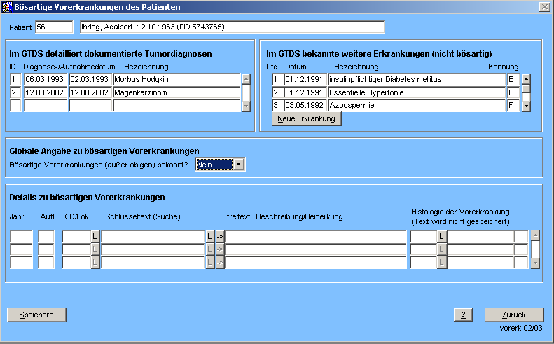 In dieser Maske werden die bösartigen Vorerkrankungen eines Patienten erfaßt. Hierunter sind Tumorerkrankungen zu verstehen, bei denen nur sehr rudimentäre und möglicherweise auch unsichere Daten vorliegen. Alle übrigen Tumorerkrankungen sollten besser als reguläre Diagnosedaten erfaßt werden.