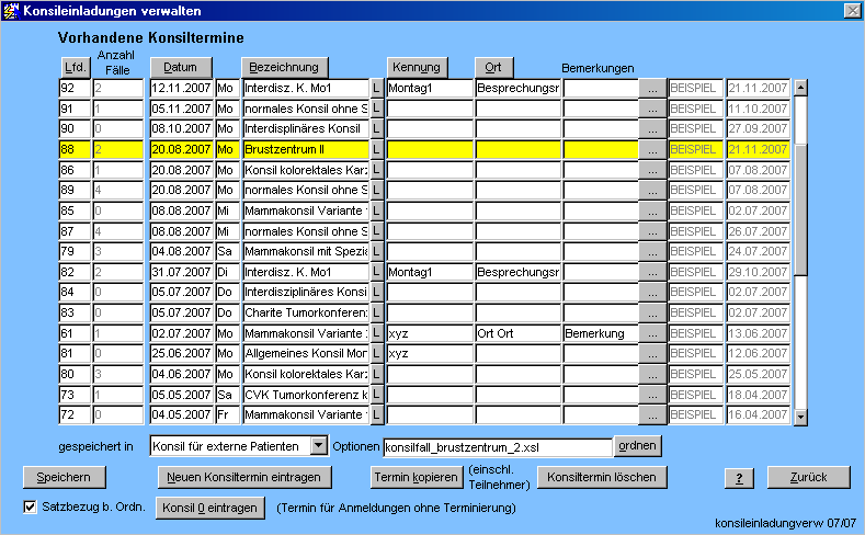 Neue Einträge erzeugt man am besten über "Neuen Konsiltermin eintragen" oder Termin kopieren. Voreinstellungen für die Vorbelegung können in den GTDS-Parametern "KONSILVERW.%" vorgenommen werden. Die Erklärung findet sich beim entsprechenden Parameter. Wichtig ist der Eintrag bei "gespeichert in", der über den Eintrag KONSILVERW.KONSILTABELLE (=KONSILEINLADUNG) eindeutig festlegt, daß nicht die GTDS-internen Konsile benutzt werden.