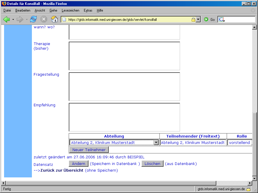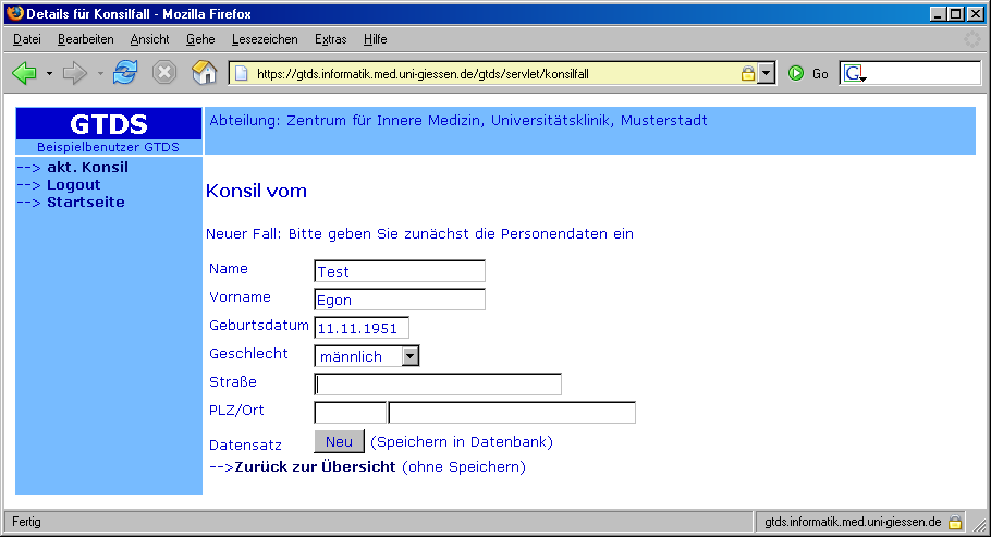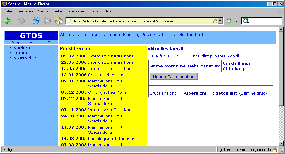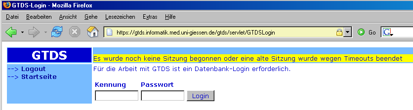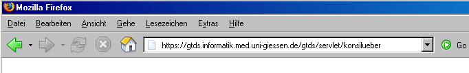Für das Einbringen von Fällen meldet sich der entsprechende Benutzer (z.B. Arzt) beim Web-GTDS an, indem er die Adresse des Web-GTDS einträgt (oder per Link oder Leszeichen auswählt). Die Adresse im folgenden Beispiel dient nur der Veranschaulichung.