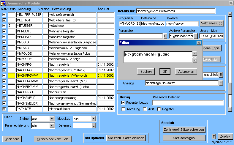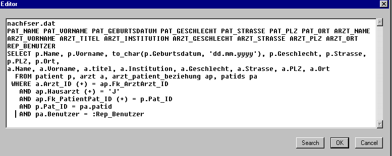 Auch wenn Sie die SQL-Anweisung nicht selbst geschrieben haben, ist es wichtig, den Inhalt zu kennen. In diesem Fall werden Details zum Patienten und zum Hausarzt aus der Datenbank herausgesucht. Auf ein und der selben Datenquelle können dann ganz unterschiedliche Serienbriefe beruhen - der Nachfragebrief, eine Liste aller Nachfragebriefe oder ein Rumpfbrief der manuell noch erweitert wird. Für einen neuen Brief auf der selben Datengrundlage genügt es also evtl., den bestehenden Eintrag in "Dynamische Module" zu kopieren und nur eine andere Serienbriefdatei unter "Dateiname" einzutragen.