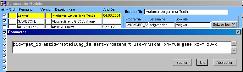 Die Parametereingabe ist derzeit noch nicht an allen Stellen verfügbar. Welche Variablen in welcher Maske zur Verfügung stehen, unterliegt der kontinuierlichen Weiterentwicklung und sollte ggf. durch eine Anfrage bei den Entwicklern geklärt werden.