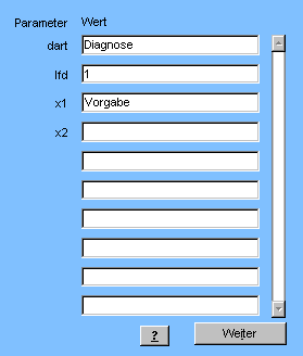 Die Angabe erfolgt als durch Leerzeichen getrennte Liste von Parametern nach der Art "Parameter=Wert". Steht als erster Buchstabe in Wert ein "?", so taucht dieser Parameter als manuell modifizierbar in der Parameterabfrage auf: