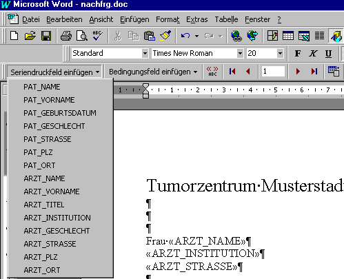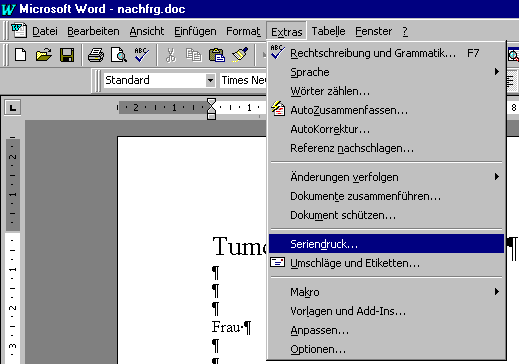 An einem Beispiel unter Nutzung von Microsoft Word (R) Version 97 soll Schritt für Schritt das Vorgehen geschildert werden. Die Serienbrieffunktionen sind in vergleichbarer Weise auch in anderen Programmversionen verfügbar. Das Anwendungsszenario ist der Nachfragebrief an den Hausarzt.