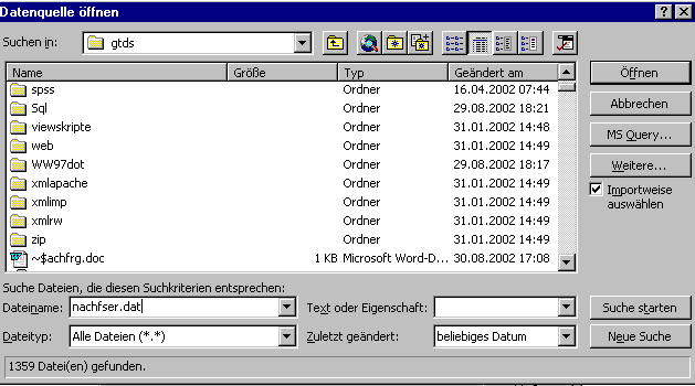 Unter "Dateiname" wird der Name der Serienbriefdatei angegeben. Ohne Pfadangaben wird diese Datei im GTDS-Verzeichnis angenommen. Ist dieses Verzeichnis, z.B. bei zentraler Installation nicht beschreibbar, kann auch, wie angegeben, ein kompletter Pfad zu irgendeiner anderen Datei auf dem Arbeitsplatzrechner angegeben werden. Wie die Serienbriefdatei erstellt wird, wird weiter unten gezeigt.