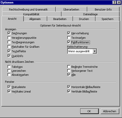 Die Anzeigemöglichkeiten können im Word variiert werden. Für die Erstellung des Serienbriefes wird empfohlen, folgende Optionen für Feldfunktionen und Anzeige der nichtdruckbaren Zeichen einzustellen: