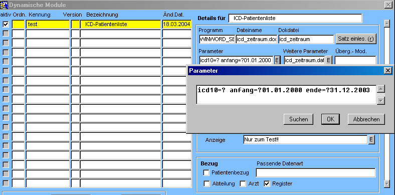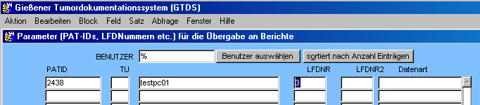 Für dieses (erst seit März 2004 realisierbare) Szenario wird keine Übergabe von Fällen über die Patids-Tabelle benötigt - allerdings soll ein Zeitraum und die ICD Diagnose eingegeben werden können. Der Aufruf erfolgt aus der Berichtsauswahl der Leirtstellen-Maske.