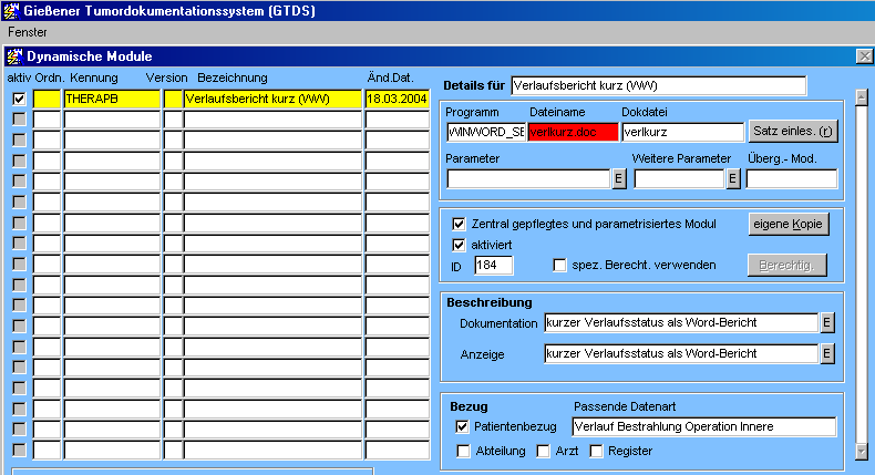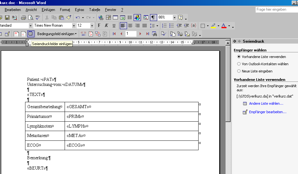 Jetzt fehlt nur noch der Serienbrief. Dazu wird mit Word zunächst ein leeres Dokument unter der Namen "verlkurz" im GTDS-Verzeichnis gespeichert. Anschließend kann der Serienbrief aus der Berichtsauswahl gestartet werden. Dabei muß er natürlich komplettiert werden. Diese Weiterbearbeitung ist versionsabhängig und wird nachfolgend nur kurz skizziert: