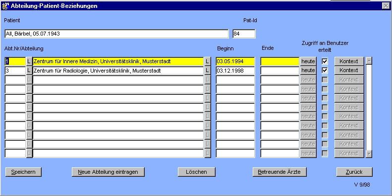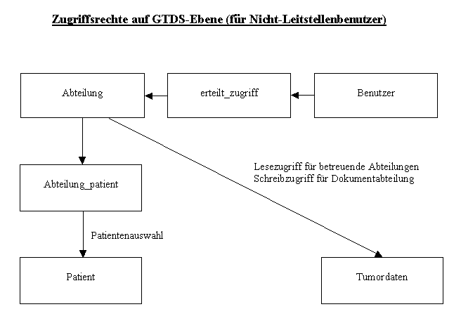Auf einige Tabellen, insbesondere die AUSWERTUNG%tabellen, bei denen eine Weiterverarbeitung von Daten außerhalb des GTDS vorgesehen ist, können andere Benutzer als der OPS$TUMSYS nur über Views (z.B. AUSWERTUNG_ALLE für die Tabelle AUSWERTUNG) zugreifen und bekommen nur Datensätze von Patienten, die in Abteilungen betreut werden (Tabelle ABTEILUNG_PATIENT, Maske abt_pat), auf die sie Zugriff haben. Das entsprechende PUBLIC SYNONYM zeigt dann auf diesen View, statt auf die Tabelle (also PUBLIC SYNONYM AUSWERTUNG zeigt auf OPS$TUMSYS.AUSWERTUNG_ALLE). Damit können die Auswertungsmasken "sicher" auch Nicht-Leitstellen-Benutzern zur Verfügung gestellt werden, zeigen aber natürlich ggf. nicht alle Patienten an. Dies gilt auch für alle "Leitstellen-Benutzer", die nicht Zugriff auf alle Abteilungen haben.