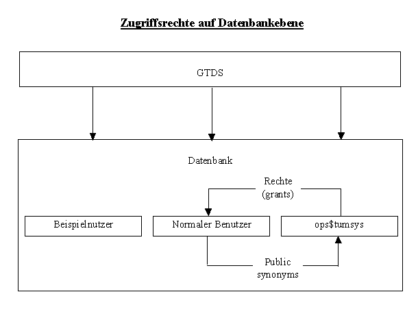 Die Daten sind dem Benutzer OPS$TUMSYS, auf Server-Ebene der Benutzer 'tumsys' zugeordnet. Er erteilt anderen Benutzern Zugriffsrechte (Leserechte und, im Fall von Bewegungsdaten, Schreibrechte) auf seine Tabellen und Sichten (Views). Zusätzlich sind für alle Tabellen (und andere Objekte wie Views und Prozeduren), auf die andere zugreifen sollen, PUBLIC SYNONYMe eingerichtet. Ohne diese müßte Benutzer MAIER zum Beispiel auf die Tabelle TUMOR von OPS$TUMSYS mit vorangestelltem Benutzernamen, also OPS$TUMSYS.TUMOR zugreifen, was die Programmierung der Masken etc. erheblich komplizierter gemacht hätte. Mit dem PUBLIC SYNONYM TUMOR für OPS$TUMSYS.TUMOR kann er dann einfach mit TUMOR zugreifen.