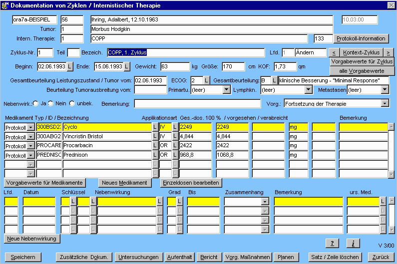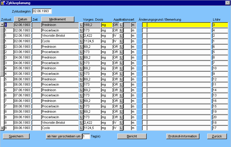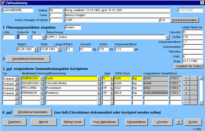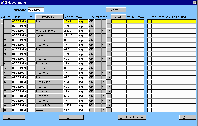 Das Chemotherapiemodul besteht aus den Komponenten Zyklusplanung und Dokumentation, die idealerweise ineinander greifen. Vor einer Chemotherapie kann die Chemotherapie geplant werden. Nach einer Chemotherapie müssen dann im günstigsten Fall nur die verabreichten Medikament "abgehakt" werden. Grundsätzlich wird zwischen der gröberen Planung über Medikamentgesamtdosisangaben und den Einzeldosisangaben unterschieden, die eine weitgehende individuelle Anpassung ermöglichen. Für beide Möglichkeiten können Protokollpläne gedruckt werden. In diesem Fall ist es ganz besonderes wichtig, daß die Angaben vom zuständigen Arzt überprüft werden.